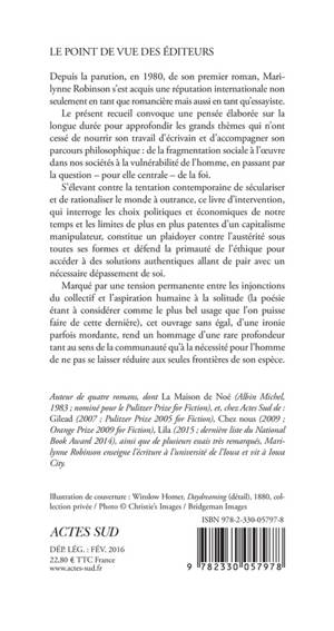Depuis la parution, en 1980, de son premier roman, Marilynne Robinson s'est acquis une réputation internationale non seulement en tant que romancière mais aussi en tant qu'essayiste. Le présent recueil convoque une pensée élaborée sur la longue durée pour approfondir les grands thèmes qui n'ont cessé de nourrir son travail d'écrivain et d'accompagner son parcours philosophique : de la fragmentation sociale à l'oeuvre dans nos sociétés à la vulnérabilité de l'homme, en passant par la question - pour elle centrale - de la foi.