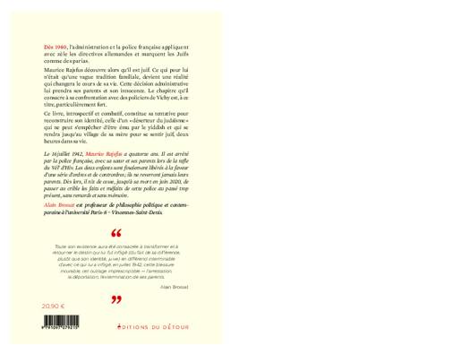 Maurice Rajsfus découvre alors qu’il est juif. Ce qui pour lui n’était qu’une tradition d’une famille lointaine restée en Pologne, devient une réalité qui changera le cours de sa vie. Cette décision administrative lui prendra ses parents et son innocence.