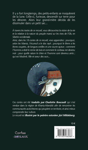À travers les textes de ce recueil, vous découvrirez la vision de la vie et la relation à la nature du peuple mansi sur les rives de l’Ob, en Sibérie occidentale. Ainsi, dans les 18 contes de ce recueil, vous appendrez : pourquoi, selon les Mansis, l’écureuil a le dos rayé ; pourquoi le lièvre a les lèvres coupées, de longues oreilles et une courte queue ; comment l’homme a doté le renne de bois et comment le corbeau est devenu noir ; pour quelle raison le chien et l’homme sont devenus amis ; qui est Moshnê, fille et soeur des ours…