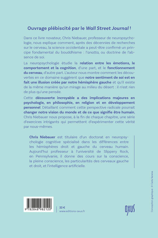 Dans ce livre novateur, Chris Niebauer, professeur de neuropsychologie, nous explique comment, après des décennies de recherches sur le cerveau, la science occidentale a peut-être confirmé un principe fondamental du bouddhisme : l’anatta, ou doctrine de l’absence de soi. La neuropsychologie étudie la relation entre les émotions, le comportement et la cognition, d’une part, et le fonctionnement du cerveau, d’autre part. L’auteur nous montre comment les découvertes en ce domaine suggèrent que notre sentiment de soi est en fait une illusion créée par notre hémisphère gauche et qu’il existe de la même manière qu’un mirage au milieu du désert : il n’est rien de plus qu’une pensée. Cette découverte incroyable a des implications majeures en psychologie, en philosophie, en religion et en développement personnel. Détaillant comment cette perspective radicale pourrait changer notre vision du monde et de ce que signifie être humain, Chris Niebauer nous propose, à la fin de chaque chapitre, une série d’exercices intrigants qui permettent d’expérimenter cette vérité par nous-mêmes.