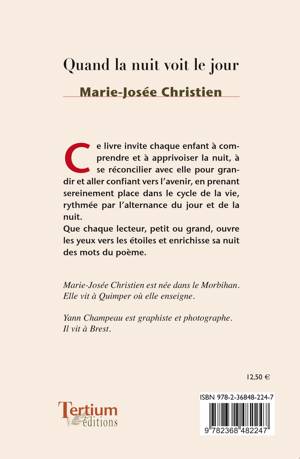 Ce livre invite chaque enfant à comprendre et à apprivoiser la nuit, à se réconcilier avec elle pour grandir et aller confiant vers l’avenir, en prenant sereinement place dans le cycle de la vie, rythmée par l’alternance du jour et de la nuit. Que chaque lecteur, petit ou grand, ouvre les yeux vers les étoiles et enrichisse sa nuit des mots du poème.