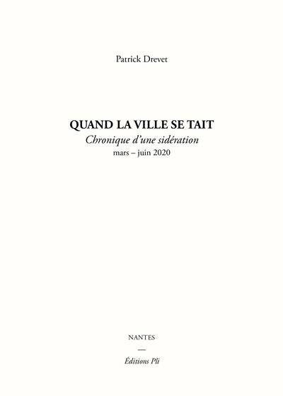 Quand la ville se tait, Chronique d'une sidération est écrit entre mars et juin 2020. Ce livre participe d'une observation de rage et de ferveur, sensible et rigoureuse, des formes et conséquences du confinement au jour le jour et dès son déclenchement. L'auteur part à la rencontre des vivants et en appelle aux gestes lisières. Quelle vie désirons-nous ? Quelles formes de vie sommes-nous prêts à défendre sans relâche ? Contre qui, et dans quelles conditions bouleversées ? Quand la ville se tait est accompagné de Choses vues, une contribution textuelle de Julien Coupat et alii.