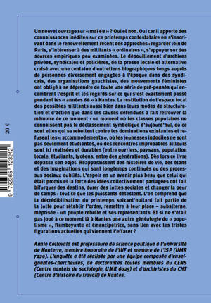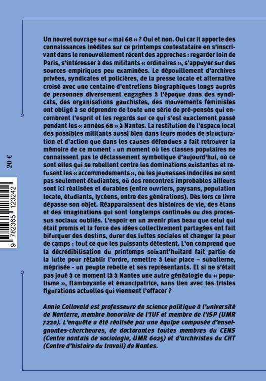 Un nouvel ouvrage sur « mai 68 »Â ? Oui et non. Oui car il apporte des connaissances inédites sur ce printemps contestataire en s’inscrivant dans le renouvellement récent des approches : regarder loin de Paris, s’intéresser à des militants « ordinaires »... Le dépouillement d’archives privées, syndicales et policières, de la presse locale et alternative croisé avec une centaine d’entretiens biographiques, des organisations gauchistes, des mouvements féministes ont obligé à se déprendre de toute une série de pré-pensés sur ce qui s’est passé pendant les « années 68 » à Nantes. Ce livre dépasse son objet. Réapparaissent des histoires de vie, des élans et des imaginations qui sont longtemps continués ou des processus sociaux oubliés. L’espoir en un avenir plus beau que celui qui était promis et la force des idées collectivement partagées ont fait bifurquer des destins, durer des luttes sociales et changer la peur de camps : tout ce que les puissants détestent.