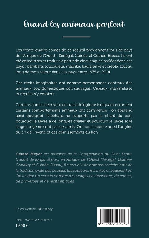 Les trente-quatre contes de ce recueil proviennent tous de pays de l'Afrique de l'Ouest : Sénégal, Guinée et Guinée-Bissau. Ils ont été enregistrés et traduits à partir de cinq langues parlées dans ces pays : bambara, toucouleur, malinké, badiaranké et créole, tout au long de mon séjour dans ces pays entre 1975 et 2014. Ces récits imaginaires ont comme personnages centraux des animaux, soit domestiques soit sauvages. Oiseaux, mammifères et reptiles s'y côtoient. Certains contes décrivent un trait étiologique indiquant comment certains comportements animaux ont commencé : on apprend ainsi pourquoi l'éléphant ne supporte pas le chant du coq, pourquoi le lièvre a de longues oreilles et pourquoi le lièvre et le singe rouge ne sont pas des amis.