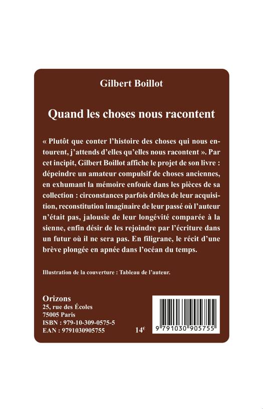 Plutôt que conter l'histoire des choses qui nous entourent, j'attends d'elles qu'elles nous racontent . Par cet incipit, Gilbert Boillot affiche le projet de son livre: dépeindre un amateur compulsif de choses anciennes, en exhumant la mémoire enfouie dans les pièces de sa collection: circonstances parfois drôles de leur acquisition, reconstitution imaginaire de leur passé où l'auteur n'était pas, jalousie de leur longévité comparée à la sienne, enfin désir de les rejoindre par l'écriture dans un futur où il ne sera pas. En filigrane, le récit d'une brève plongée en apnée dans l'océan du temps.