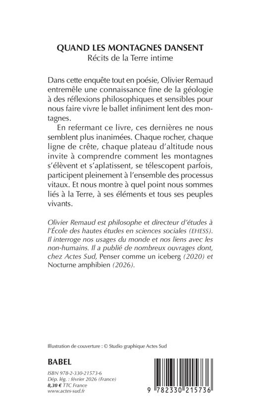 Dans cette enquête tout en poésie, Olivier Remaud entremêle une connaissance fine de la géologie à des réflexions philosophiques et sensibles pour nous faire vivre le ballet infiniment lent des montagnes. En refermant ce livre, ces dernières ne nous semblent plus inanimées. Chaque rocher, chaque ligne de crête, chaque plateau d'altitude nous invite à comprendre comment les montagnes s'élèvent et s'aplatissent, se télescopent parfois, participent pleinement à l'ensemble des processus vitaux. Et nous montre à quel point nous sommes liés à la Terre, à ses éléments et tous ses peuples vivants.