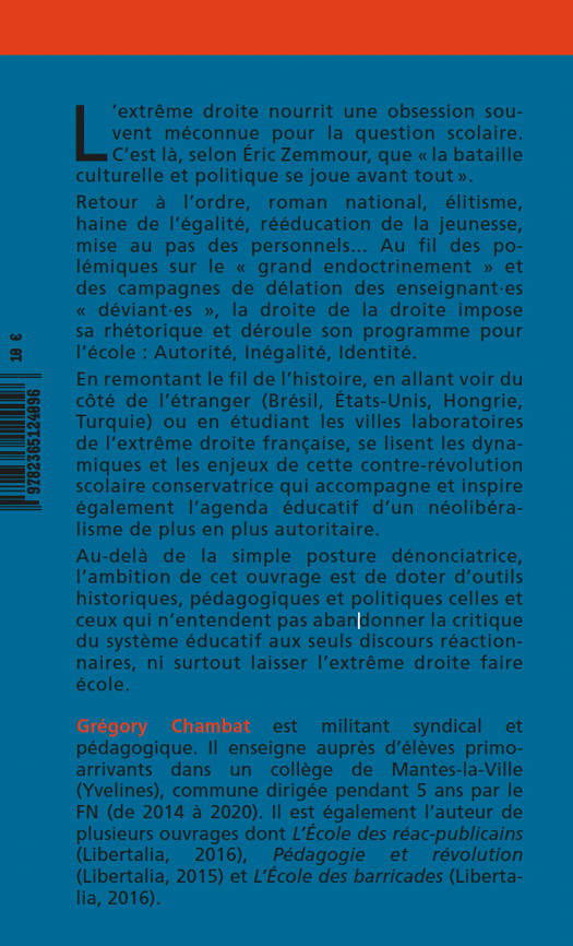 L'extrême droite nourrit une obsession souvent méconnue pour la question scolaire. C'est là, selon Éric Zemmour, que « la bataille culturelle et politique se joue avant tout ». Retour à l'ordre, roman national, élitisme, haine de l'égalité, rééducation de la jeunesse, mise au pas des personnels... au fil des polémiques sur le « grand endoctrinement » et des campagnes de délation des enseignant·es « déviant·es », la droite de la droite impose sa rhétorique et déroule son programme pour l'école : Autorité, Inégalité, Identité. En remontant le fil de l'histoire, en allant voir du côté de l'étranger (Brésil, États-Unis, Hongrie, Turquie) ou en étudiant les villes laboratoires de l'extrême droite française, se lisent les dynamiques et les enjeux de cette contre-révolution scolaire conservatrice qui accompagne et inspire également l'agenda éducatif d'un néolibéralisme de plus en plus autoritaire. Au-delà de la simple posture dénonciatrice, l'ambition de cet ouvrage est de doter d'outils historiques, pédagogiques et politiques celles et ceux qui n'entendent pas abandonner la critique du système éducatif aux seuls discours réactionnaires ni surtout laisser l'extrême droite faire école.