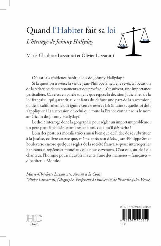 T'habites où, Johnny ' Si la question traverse la vie de Jean-Philippe Smet, elle revêt, à l'occasion de la rédaction de ses testaments et des procès qui s'ensuivent, une importance particulière. Car c'est en partie sur elle que repose la décision judiciaire : de la loi française, qui garantit aux enfants du défunt une part de la succession, ou de la californienne qui ignore cette « réserve héréditaire», quelle loi doit s'appliquer à la succession de celui que toute la France connaît sous le nom américain de Johnny Hallyday ' Le droit interroge donc la géographie pour régler un important problème : un père peut-il choisir, parmi ses enfants, ceux qu'il déshérite ' Loin des postures moralisatrices aussi bien que de l'idée de se substituer à la justice, ce livre atteste que, même après son décès, Jean-Philippe Smet bouleverse encore quelques règles de la société française pour interroger les habitants européens et mondiaux que nous devenons. C'est que, au-delà du chanteur, l'homme pourrait avoir inventé l'une des manières - françaises- d'habiter le Monde.