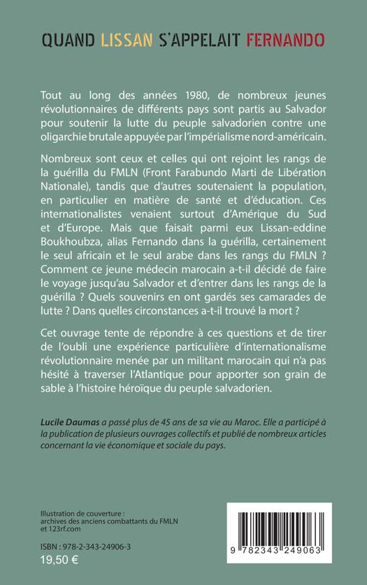 Tout au long des années 1980, de nombreux jeunes révolutionnaires de différents pays sont partis au Salvador pour soutenir la lutte du peuple salvadorien contre une oligarchie brutale appuyée par l’impérialisme nord-américain. Nombreux ont rejoint les rangs de la guérilla du FMLN (Front Farabundo Marti de Libération Nationale), tandis que d’autres soutenaient la population, en particulier en matière de santé et d’éducation. Ces internationalistes venaient surtout d’Amérique du Sud et d’Europe. Mais que faisait parmi eux Lissan-eddine Boukhoubza, alias Fernando dans la guérilla ? Comment ce jeune médecin marocain a-t-il décidé de faire le voyage jusqu’au Salvador ? Quels souvenirs en ont gardés ses camarades de lutte ? Dans quelles circonstances a-t-il trouvé la mort ? Cet ouvrage tente de répondre à ces questions et de tirer de l’oubli une expérience particulière d’internationalisme révolutionnaire menée par un militant marocain qui n’a pas hésité à traverser l’Atlantique pour apporter son grain de sable à l’histoire héroïque du peuple salvadorien.