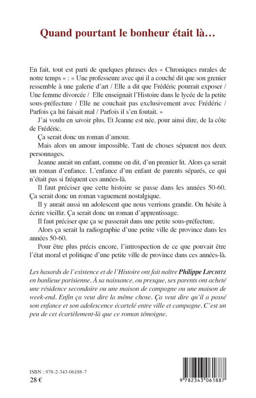 Ça serait un roman d'amour entre Jeanne et Frédéric. Mais un amour impossible. Tant de choses séparent nos deux personnages. Jeanne aurait un enfant d'un "premier lit". Il faut préciser que cette histoire se passerait dans les années 50-60, dans une petite sous-préfecture. Il y aurait aussi un adolescent que nous verrions grandir. L'auteur a passé son enfance et son adolescence écartelé entre ville et campagne. C'est un peu de cet écartèlement-là que ce roman témoigne.