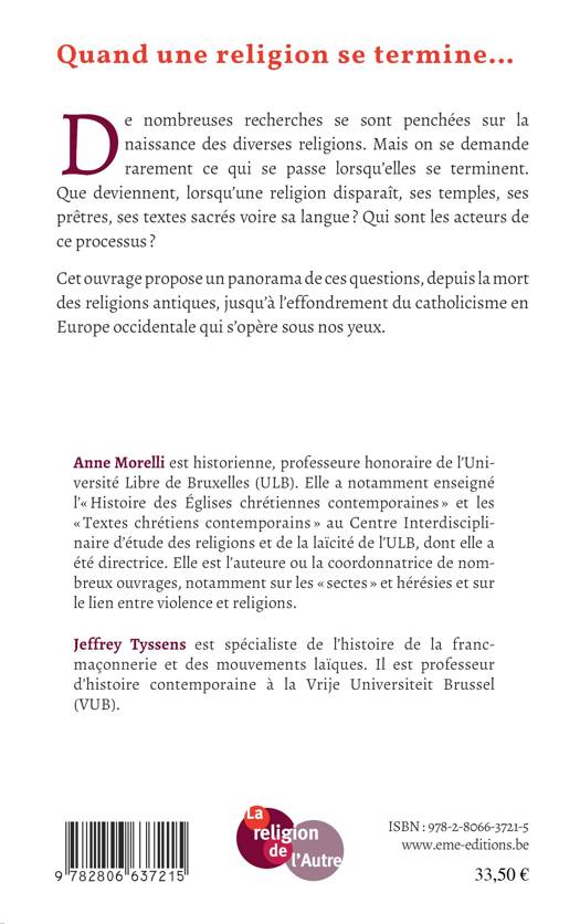 De nombreuses recherches se sont penchées sur la naissance des diverses religions. Mais on se demande rarement ce qui se passe lorsqu'elles se terminent. Que deviennent, lorsqu'une religion disparaît, ses temples, ses prêtres, ses textes sacrés voire sa langue ? Qui sont les acteurs de ce processus ? Cet ouvrage propose un panorama de ces questions, depuis la mort des religions antiques, jusqu'à l'effondrement du catholicisme en Europe occidentale qui s'opère sous nos yeux.