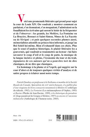 Nouvelle edition revue et corrigee Voici une promenade litteraire qui prend pour sujet la cour de Louis XIV. On voudrait y montrer comment en parlaient, s'en etonnaient, s'en moquaient, l'admiraient ou la fouaillaient les ecrivains qui eurent le loisir de la frequenter et de l'observer: les grands, les Moliere, La Fontaine ou La Bruyere, Bossuet et Saint-Simon, Mmes de La Fayette ou de Sevigne; et puis quelques secondes plumes aussi, memorialistes attentifs ou princes bien informes, et jusqu'au Roi Soleil lui-meme. Rien d'exhaustif dans ces choix. Plus que le souci d'analyse historique, le plaisir litteraire les a gouvernes, qui voudrait se transmettre au lecteur: lui faire savourer le coup d'oeil et le coup de patte, la musique de la langue incisive et pleine, l'economie du tour et du trait, signatures de ces auteurs qu'on a peut-etre tort de dire classiques, de ne dire que classiques. Un hommage a la plume et a l'esprit, qui suggere sur la cour d'alors et de toujours quelques verites d'analyse et de satire propres a eclairer aussi notre temps.
