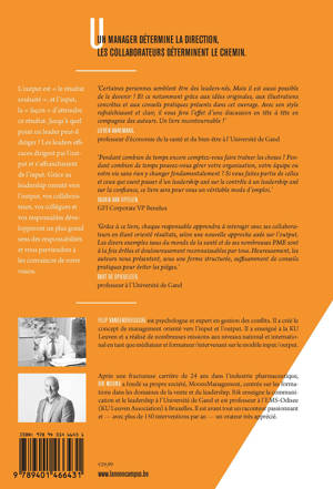 L'output est « le résultat souhaité », et l'input, la « façon » d'atteindre ce résultat. Jusqu'à quel point un leader peut-il diriger ? Les leaders efficaces dirigent par l'output et s'affranchissent de l'input. Grâce au leadership orienté vers l'output, vos collaborateurs, vos collègues et vos responsables développeront un plus grand sens des responsabilités et vous parviendrez à lesconvaincre de votre vision.