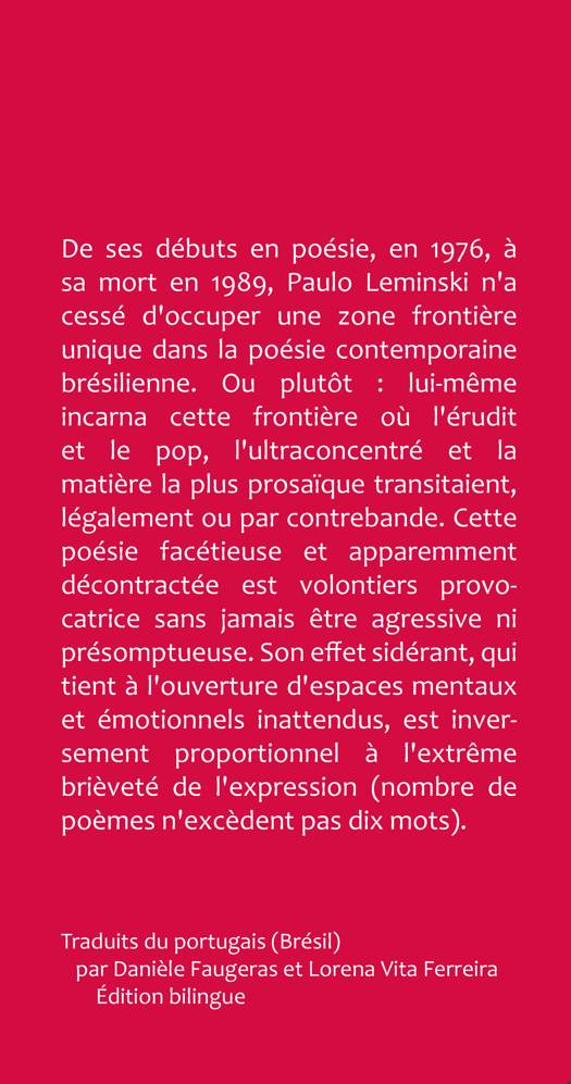 De ses débuts en poésie, en 1976, à sa mort en 1989, Paulo Leminski n'a cessé d'occuper une zone frontière unique dans la poésie contemporaine brésilienne. Ou plutôt : lui-même incarna cette frontière où l'érudit et le pop, l'ultraconcentré et la matière la plus prosaïque transitaient, légalement ou par contrebande. Cette poésie facétieuse et apparemment décontractée est volontiers provocatrice sans jamais être agressive ni présomptueuse. Son effet sidérant, qui tient à l'ouverture d'espaces mentaux et émotionnels inattendus, est inversement proportionnel à l'extrême brièveté de l'expression (nombre de poèmes n'excèdent pas dix mots).