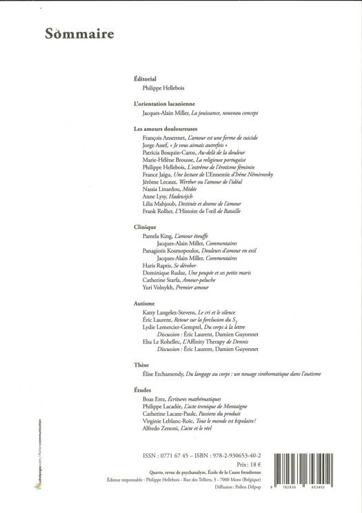 Un numéro consacré à l'amour et à aux interprétations psychanalytiques des douleurs qu'il engendre. Les contributeurs abordent les drames de la relation amoureuse, la temporalité de la passion ou encore différents exemples d'amours contrariées dans la littérature.