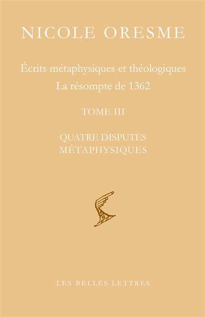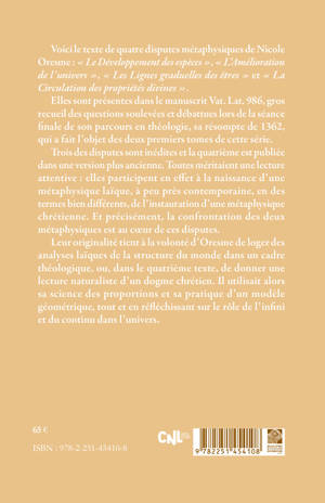 Voici le texte de quatre disputes metaphysiques de Nicole Oresme: Le Developpement des especes, L'Amelioration de l'univers, Les Lignes graduelles des etres et La Circulation des proprietes divines. Elles sont presentes dans le manuscrit Vat. Lat. 986, gros recueil des questions soulevees et debattues lors de la seance finale de son parcours en theologie, sa resompte de 1362, qui a fait l'objet des deux premiers tomes de cette serie. Trois des disputes sont inedites et la quatrieme est publiee dans une version plus ancienne. Toutes meritaient une lecture attentive: elles participent en effet a la naissance d'une metaphysique laique, a peu pres contemporaine, en des termes bien differents, de l'instauration d'une metaphysique chretienne. Et precisement, la confrontation des deux metaphysiques est au coeur de ces disputes. Leur originalite tient a la volonte d'Oresme de loger des analyses laiques de la structure du monde dans un cadre theologique, ou, dans le quatrieme texte, de donner une lecture naturaliste d'un dogme chretien. Il utilisait alors sa science des proportions et sa pratique d'un modele geometrique, tout et en reflechissant sur le role de l'infini et du continu dans l'univers.