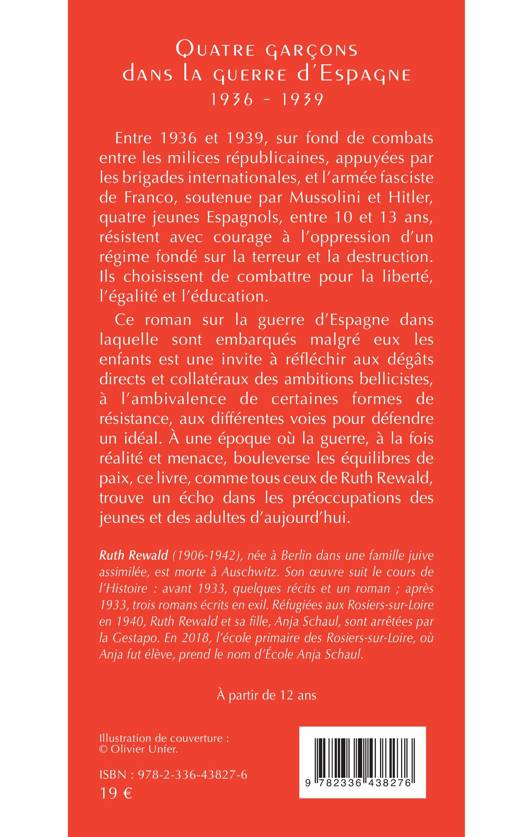 Entre 1936 et 1939, sur fond de combats entre les milices républicaines, appuyées par les brigades internationales, et l’armée fasciste de Franco, soutenue par Mussolini et Hitler, quatre jeunes Espagnols, entre 10 et 13 ans, résistent avec courage à l’oppression d’un régime fondé sur la terreur et la destruction. Ils choisissent de combattre pour la liberté, l’égalité et l’éducation. Ce roman sur la guerre d’Espagne dans laquelle sont embarqués malgré eux les enfants est une invite à réfléchir aux dégâts directs et collatéraux des ambitions bellicistes, à l’ambivalence de certaines formes de résistance, aux différentes voies pour défendre un idéal. À une époque où la guerre, à la fois réalité et menace, bouleverse les équilibres de paix, ce livre, comme tous ceux de Ruth Rewald, trouve un écho dans les préoccupations des jeunes et des adultes d’aujourd’hui. À partir de 12 ans.