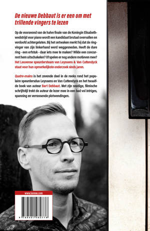 Quatre-mains is het zevende deel in de reeks rond het populaire speurdersduo Leyssens en Van Cattendyck en het twaalfde boek van auteur Bart Debbaut. Met zijn snedige, filmische schrijfstijl trekt de auteur de lezer mee in een bad vol intriges, spanning en verrassende plotwendingen.