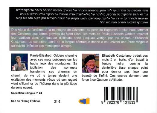 Paule-Élisabeth Oddero chemine avec ses mots poétiques sur les hauts lieux des montagnes. Sa jubilation des sommets transforme ses chemins en chemin de vie où le temps devient une exaltation des moments vécus où son regard vient s’illuminer de l’hébreu dans la plénitude du sens ouvert. Élisabeth Castoriano traduit ces mots-là en traits, d’un travail à l’encre noire, comme la dentellière tisse chaque point pour donner aux lieux une beauté de l’infini. Ces encres donnent une force à ce Quatuor d’Altitude. Ce livre est bilingue Français et Hébreu.
