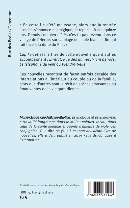 En cette fin d'été maussade, alors que la rentrée scolaire s'annonce nostalgique, je repense à nos quinze ans. Depuis combien d'étés n'es-tu pas revenu dans ce village de l'Herbe, sur sa plage de sable blanc et fin qui fait face à la dune du Pila. Cap Ferret est le titre de cette nouvelle que d'autres accompagnent: Etretat, Rue des dames, Vivre dehors, Le téléphone du vent ou Viendra-t-elle ? Ces nouvelles racontent de façon parfois décalée des interrelations à l'intérieur du couple ou de la famille, alors que d'autres sont le récit de scènes amusantes ou émouvantes de la vie quotidienne.