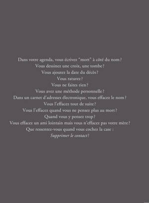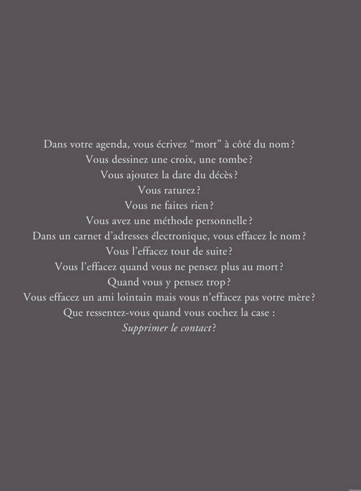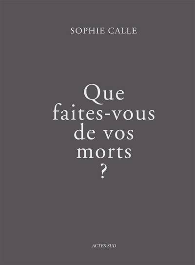 En 2017, à l'occasion du décès de son père, Sophie Calle s'est posé cette question qu'elle partage avec nous : "Que faites-vous de vos morts ?". La première édition de ce livre regroupait des photographies prises par l'artiste à travers le monde dans des cimetières, accompagnées d'une sélection de messages laissés par les visiteurs. Cette nouvelle édition intègre les messages recueillis lors de son exposition à la chapelle du Centre de la Vieille Charité à Marseille en 2019 .