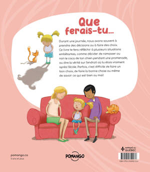 Il arrive souvent durant la journée que nous ayons à prendre une décision ou à faire un choix. Ce livre te fera réfléchir à plusieurs situations embêtantes comme décider de ramasser le caca de ton chien pendant une promenade ou non, ou dire la vérité sur l'endroit où tu étais vraiment après l'école ? Parfois, c'est difficile de faire un bon choix, de faire la bonne chose ou même de savoir ce qui est bien et ce qui est mal !