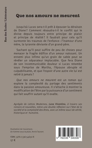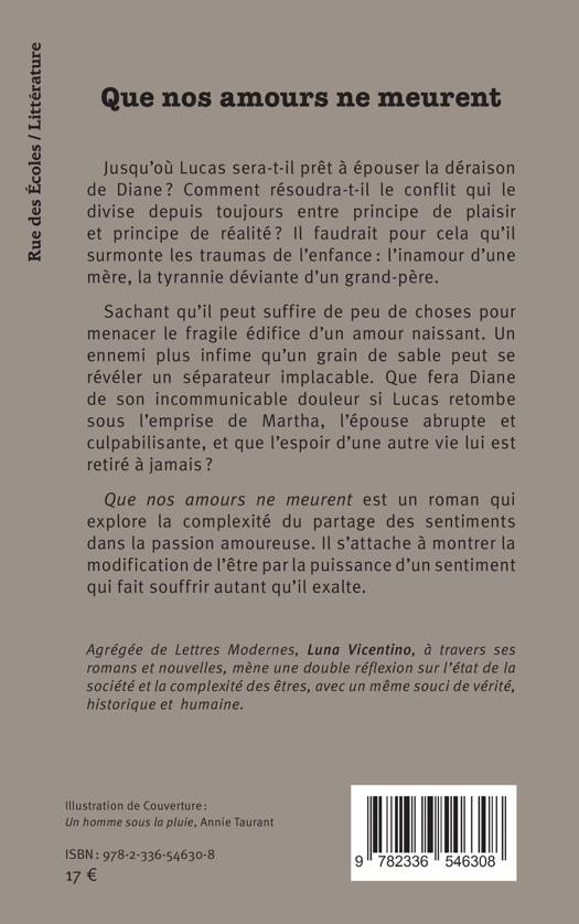 Jusqu’où Lucas sera-t-il prêt à épouser la déraison de Diane ? Comment résoudra-t-il le conflit qui le divise depuis toujours entre principe de plaisir et principe de réalité ? Il faudrait pour cela qu’il surmonte les traumas de l’enfance : l’inamour d’une mère, la tyrannie déviante d’un grand-père. Sachant qu’il peut suffire de peu de choses pour menacer le fragile édifice d’un amour naissant. Un ennemi plus infime qu’un grain de sable peut se révéler un séparateur implacable. Que fera Diane de son incommunicable douleur si Lucas retombe sous l’emprise de Martha, l’épouse abrupte et culpabilisante, et que l’espoir d’une autre vie lui est retiré à jamais ? Que nos amours ne meurent est un roman qui explore la complexité du partage des sentiments dans la passion amoureuse. Il s’attache à montrer la modification de l’être par la puissance d’un sentiment qui fait souffrir autant qu’il exalte.
