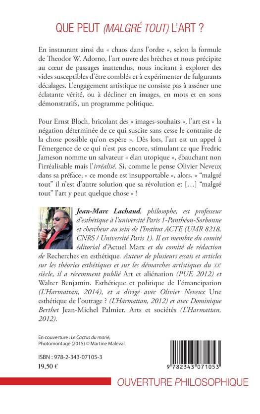 L'art ouvre des brèches et nous précipite au cur de passages inattendus, nous incite à explorer des vides susceptibles d'être comblés et à expérimenter de fulgurants décalages; instaurant, selon la formule d'Adorno, « le chaos dans l'ordre ». Dès lors, l'art est un appel à l'émergence de ce qui n'est pas encore, ébauchant non l'irréalisable mais l'irréalisé. Alors si comme le pense Olivier Neveux, « ce monde est insupportable » il n'est d'autre solution que sa révolution et l'art y peut quelque chose, malgré tout.