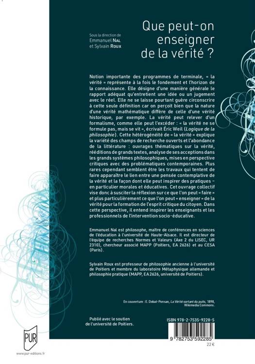 Notion très importante des programmes de terminale, « la vérité » représente à la fois le fondement et l’horizon de la connaissance. Elle désigne d’une manière générale le rapport adéquat qu’entretient une idée ou un jugement avec le réel. Elle ne se laisse pourtant guère circonscrire à cette seule définition car on perçoit bien que la nature d’une vérité mathématique diffère de celle d’une vérité historique, par exemple. La vérité peut relever d’un formalisme, comme elle peut l’excéder : « la vérité ne se formule pas, mais se vit », écrivait Éric Weil (Logique de la philosophie). Cette hétérogénéité de « la vérité » explique la variété des champs de recherche ouverts et l’abondance de la littérature : ouvrages thématiques sur la vérité, rééditions de grands textes, analyse de ses acceptions dans les grands systèmes philosophiques, mises en perspective critiques avec des problématiques contemporaines. Plus rares cependant semblent être les travaux qui tentent de faire apparaître le lien entre une pensée contemplative de la vérité et la façon dont elle peut inspirer des pratiques – en particulier morales et éducatives. Cet ouvrage collectif vise donc à susciter la réflexion sur ce que l’on peut « faire » et plus particulièrement ce que l’on peut « enseigner » de la vérité pour la formation de l’esprit critique du citoyen. Dans cette perspective, il entend inspirer les enseignants et les professionnels de l’intervention socio-éducative.