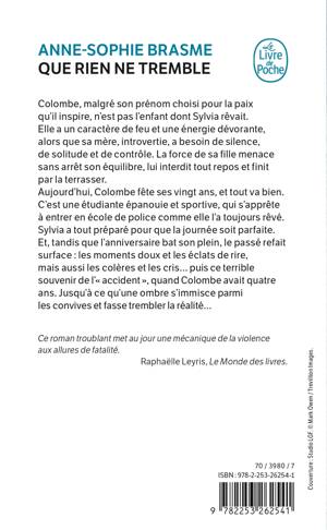 Colombe, malgré son prénom choisi pour la paix qu’il inspire, n’est pas l’enfant dont Sylvia rêvait. Elle a un caractère de feu et une énergie dévorante quand sa mère, introvertie, a besoin de silence, de solitude et de contrôle. La force de sa fille menace sans arrêt son équilibre, lui interdit tout repos et finit par la terrasser. Aujourd’hui, Colombe a vingt ans, et tout va bien. C’est une étudiante épanouie, fêtarde et sportive, qui s’apprête à entrer en école de police comme elle l’a toujours rêvé. Sylvia a tout préparé pour que l’anniversaire soit parfait. Et, tandis que la fête bat son plein, le passé refait surface : les moments doux et les éclats de rire, mais aussi les colères et les cris… puis ce terrible souvenir de l’« accident », quand Colombe avait quatre ans. Jusqu’à ce qu’une ombre s’immisce dans cette journée ensoleillée et fasse trembler la réalité…