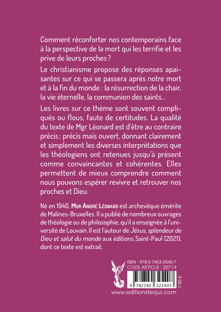 Ce court texte est extrait du beau livre de Mgr Léonard : Jésus, splendeur de Dieu et salut du monde (Éditions Saint-Paul), qui explique si bien toute l’histoire du Salut. Mais il nous a semblé intéressant d’attirer l’attention sur cette présentation remarquable de la fin du monde, qui explicite de manière synthétique ce que l’Église et les théologiens ont compris de ce qui se passera après notre mort et à la fin du monde, c’est-à-dire quand le monde aura atteint sa finalité, sa perfection. La plupart des livres sur ce thème sont compliqués ou elliptiques faute de certitudes : la qualité de ce texte-ci est d’être au contraire précis , précis mais ouvert, donnant clairement et simplement, quand il y en a plusieurs, les diverses interprétations que les théologiens ont retenues comme convaincantes et cohérentes avec la doctrine catholique. Et renvoyant vers leurs auteurs pour les approfondir. Ce livret offre ainsi le kit de la vie après la mort dont la majorité des lecteurs ont besoin.