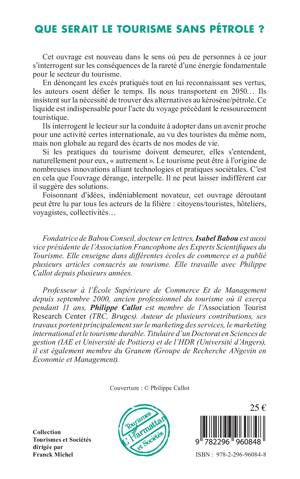 Quelles vont être les conséquences de la rareté du pétrole sur le secteur du tourisme ? Quelle conduite adopter dans un avenir proche et quelles sont les alternatives au kérosène/pétrole ? Si les pratiques du tourisme doivent demeurer, elles doivent, dès aujourd'hui, s'entendre autrement. Foisonnant d'idées, novateur et déroutant, ce livre s'adresse à tous les acteurs de la filière, touristes, voyagistes, collectivités, etc.