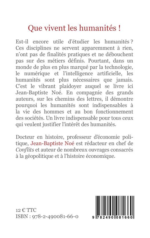 Est-il encore utile d'étudier les humanités ? Ces disciplinesne servent apparemment à rien, n'ont pas de finalités pratiques et ne débouchentpas sur des métiers définis. Pourtant, dans un monde de plus en plus marqué parla technologie, le numérique et l'intelligence artificielle, les humanités sontplus nécessaires que jamais. C'est le vibrant plaidoyer auquel se livre iciJean-Baptiste Noé. En compagnie des grands auteurs, sur les chemins des lettres,il démontre pourquoi les humanités sont indispensables à la vie des hommes et aubon fonctionnement des sociétés. Un livre indispensable pour tousceux qui veulent justifier l'intérêt des humanités.