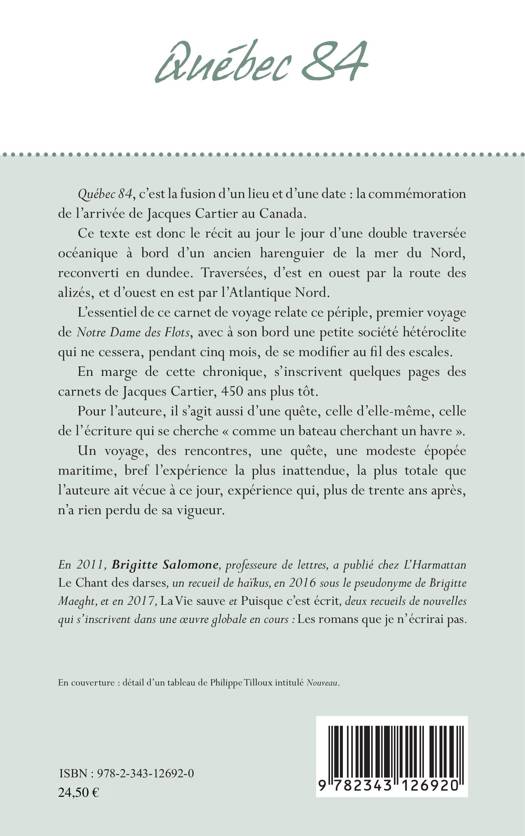 Québec 84, c'est la fusion d'un lieu et d'une date : la commémoration de l'arrivée de Jacques Cartier au Canada. Ce texte est donc le récit au jour le jour d'une double traversée océanique à bord d'un ancien harenguier de la mer du Nord, reconverti en dundee. Traversées, d'est en ouest par la route des alizés, et d'ouest en est par l'Atlantique Nord. En marge de cette chronique, s'inscrivent quelques pages des carnets de Jacques Cartier, 450 ans plus tôt. Pour l'auteur, il s'agit d'une quête, celle d'elle-même, celle de l'écriture qui se cherche "comme un bateau cherchant un havre".