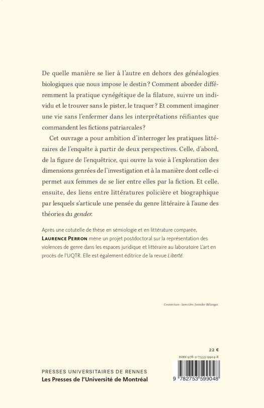 De quelle manière se lier à l’autre en dehors des généalogies biologiques que nous impose le destin ? Comment aborder différemment la pratique cynégétique de la filature, suivre un individu et le trouver sans le pister, le traquer ? Et comment imaginer une vie sans l’enfermer dans les interprétations réifiantes que commandent les actions patriarcales ? Cet ouvrage a pour ambition d’interroger les pratiques littéraires de l’enquête à partir de deux perspectives. Celle, d’abord, de la figure de l’enquêtrice, qui ouvre la voie à l’exploration des dimensions genrées de l’investigation et à la manière dont celle-ci permet aux femmes de se lier entre elles par l'action. Et celle, ensuite, des liens entre littératures policière et biographique par lesquels s’articule une pensée du genre littéraire à l’aune des théories du gender.