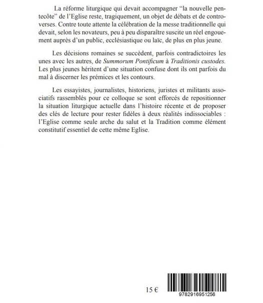 La réforme liturgique qui devait accompagner la nouvelle pentecôte de l'Eglise reste, tragiquement, un objet de débats et de controverses. Contre toute attente la célébration de la messe traditionnelle qui devait, selon les novateurs, peu à peu disparaître suscite un réel engouement auprès d'un public, ecclésiastique ou laïc, de plus en plus jeune. Les décisions romaines se succèdent, parfois contradictoires les unes avec les autres, de Summorum Pontificum à Traditionis custodes. Les plus jeunes héritent d'une situation confuse dont ils ont parfois du mal à discerner les prémices et les contours. Les essayistes, journalistes, historiens, juristes et militants associatifs rassemblés pour ce colloque se sont efforcés de repositionner la situation liturgique actuelle dans l'histoire récente et de proposer des clés de lecture pour rester fidèles à deux réalités indissociables : l'Eglise comme seule arche du salut et la Tradition comme élément constitutif essentiel de cette même Eglise.