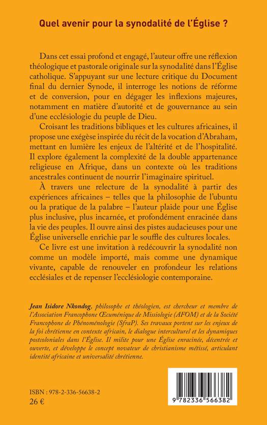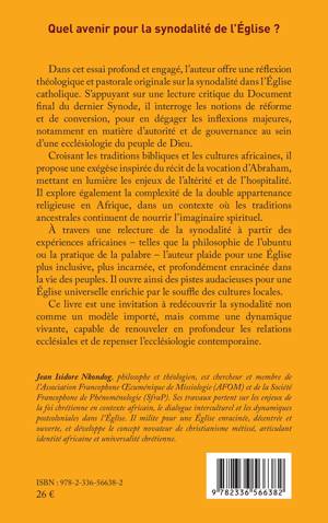 Dans cet essai profond et engagé, l’auteur offre une réflexion théologique et pastorale originale sur la synodalité dans l’Église catholique. S’appuyant sur une lecture critique du Document final du dernier Synode, il interroge les notions de réforme et de conversion, pour en dégager les inflexions majeures, notamment en matière d’autorité et de gouvernance au sein d’une ecclésiologie du peuple de Dieu. Croisant les traditions bibliques et les cultures africaines, il propose une exégèse inspirée du récit de la vocation d’Abraham, mettant en lumière les enjeux de l’altérité et de l’hospitalité. Il explore également la complexité de la double appartenance religieuse en Afrique, dans un contexte où les traditions ancestrales continuent de nourrir l’imaginaire spirituel. À travers une relecture de la synodalité à partir des expériences africaines – telles que la philosophie de l’ubuntu ou la pratique de la palabre – l’auteur plaide pour une Église plus inclusive, plus incarnée, et profondément enracinée dans la vie des peuples. Il ouvre ainsi des pistes audacieuses pour une Église universelle enrichie par le souffle des cultures locales. Ce livre est une invitation à redécouvrir la synodalité non comme un modèle importé, mais comme une dynamique vivante, capable de renouveler en profondeur les relations ecclésiales et de repenser l’ecclésiologie contemporaine.