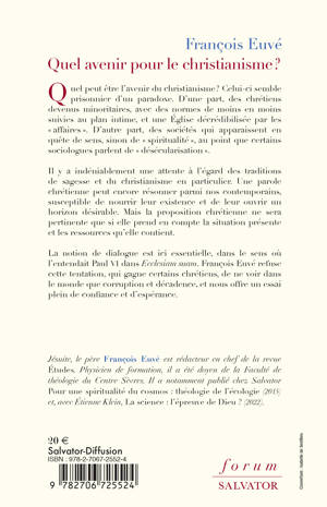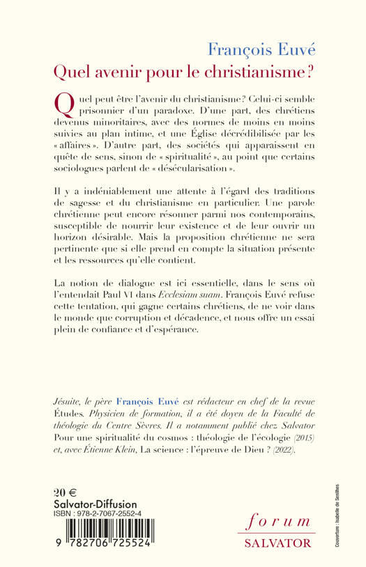 Quel peut être l'avenir du christianisme ? Celui-ci semble prisonnier d'un paradoxe. D'une part, des chrétiens devenus minoritaires, avec des normes de moins en moins suivies au plan intime, et une Église décrédibilisée par les « affaires ». D'autre part, des sociétés qui apparaissent en quête de sens, sinon de « spiritualité », au point que certains sociologues parlent de « désécularisation ». Il y a indéniablement une attente à l'égard des traditions de sagesse et du christianisme en particulier. Une parole chrétienne peut encore résonner parmi nos contemporains, susceptible de nourrir leur existence et de leur ouvrir un horizon désirable. Mais la proposition chrétienne ne sera pertinente que si elle prend en compte la situation présente et les ressources qu'elle contient. La notion de dialogue est ici essentielle, dans le sens où l'entendait Paul VI dans Ecclesiam suam. François Euvé refuse cette tentation, qui gagne certains chrétiens, de ne voir dans le monde que corruption et décadence, et nous offre un essai plein de confiance et d'espérance. Jésuite, le père François Euvé est rédacteur en chef de la revue Études. Physicien de formation, il a été doyen de la Faculté de théologie du Centre Sèvres. Il a notamment publié chez Salvator Pour une spiritualité du cosmos : théologie de l'écologie (2015) et, avec Étienne Klein, La science : l'épreuve de Dieu ? (2022).