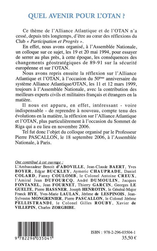 Ce thème de l'Alliance Atlantique et de l'OTAN n'a cessé, depuis très longtemps, d'être au coeur des réflexions du Club "Participation et Progrès". A plusieurs reprises ces quinze dernières années les meilleurs experts civils et militaires en la matière se sont réunis pour analyser et débattre sur ce sujet. Ils ont repris récemment leur réflexion, compte tenu des évolutions en la matière, sur l'avenir de l'OTAN et de ses nouvelles orientations.