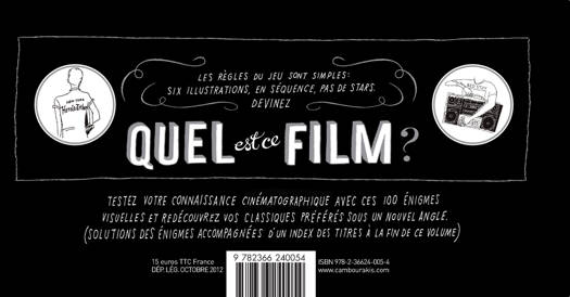 Une ballade subjective à travers l'histoire du cinéma : devinez le titre de cent films célèbres grâce à six dessins, six détails qui évitent les figures de stars ou les scènes les plus connues. Un livre-jeu en hommage au septième art, qui fait sensation aux Etats-Unis.