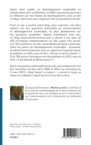 Après avoir publié Le développement soutenable en collaboration avec un béninois, en 2007, nous avons poursuivi la reflexion sur nos modes de déveleoppement, avec un oeil critique, mais aussi pour esquisser des propositions d'action. Nous renouvelons cette expérience avec une centaine de mini éco-nouvelles écrites entre 2008 et 2016. La chronique de 5 mars 2013 « Quel foutoir la nature ! » prend ici toute sa valeur en reflétant l'esprit du livre et en fait le titre.