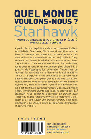 À partir de son expérience dans le mouvement altermondialiste, Starhawk, féministe et sorcière, aborde dans cet ouvrage des questions cruciales qui sont toujours celles des mouvements sociaux aujourd'hui. Elle y examine tour à tour la relation à la nature et aux lieux, l'organisation d'une démocratie directe, les problèmes posés pour construire un mouvement plus diversifié, la question de l'appropriation culturelle, l'importance de repenser la non-violence, le lien entre la spiritualité et l'action... Il s'agit, comme le souligne la philosophe belge Isabelle Stengers, de « participer au travail de connexion, non seulement entre celles et ceux qui résistent et luttent aujourd'hui, mais aussi entre le passé et le présent. Car, s'il n'est pas nourri par l'expérience du passé, le présent s'étiole comme une plante que le sol ne nourrit pas. [...] Starhawk nous demande d'accepter de penser avec l'image du Titanic : nous y sommes, en route vers la collision, et s'il doit y avoir une chance d'avenir, c'est nous, maintenant, qui devons entre-accepter nos divergences et agir ensemble ».
