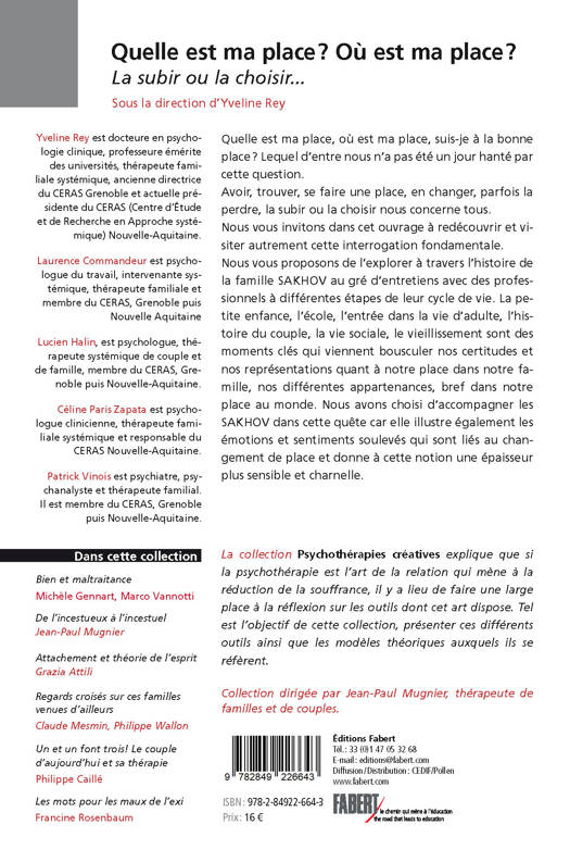 Quelle est ma place, où est ma place, suis-je à la bonne place ? Lequel d’entre nous n’a pas été un jour hanté par cette question. Avoir, trouver, se faire une place, en changer, parfois la perdre, la subir ou la choisir nous concerne tous. Nous vous invitons dans cet ouvrage à redécouvrir et visiter autrement cette interrogation fondamentale. Nous vous proposons de l’explorer à travers l’histoire de la famille SAKHOV au gré d’entretiens avec des professionnels à différentes étapes de leur cycle de vie. La petite enfance, l’école, l’entrée dans la vie d’adulte, l’histoire du couple, la vie sociale, le vieillissement etc. sont des moments clés qui viennent bousculer nos certitudes et nos représentations quant à notre place dans notre famille, nos différentes appartenances, bref dans notre place au monde. Nous avons choisi d’accompagner les SAKHOV dans cette quête car elle illustre également les émotions et sentiments soulevés qui sont liés au changement de place et donne à cette notion une épaisseur plus sensible et charnelle. Yveline REY est docteure en psychologie clinique, professeure émérite des universités, thérapeute familiale systémique, ancienne directrice du CERAS Grenoble et actuelle présidente du CERAS (Centre d’Étude et de Recherche en Approche systémique) Nouvelle-Aquitaine. Laurence COMMANDEUR est psychologue du travail, intervenante systémique, thérapeute familiale et membre du CERAS, Grenoble puis Nouvelle Aquitaine Lucien HALIN, est psychologue, thérapeute systémique de couple et de famille, membre du CERAS, Grenoble puis Nouvelle-Aquitaine. Céline PARIS ZAPATA est psychologue clinicienne, thérapeute familiale systémique et responsable du CERAS Nouvelle-Aquitaine. Patrick VINOIS est psychiatre, psychanalyste et thérapeute familial. Il est membre du CERAS, Grenoble puis Nouvelle-Aquitaine.