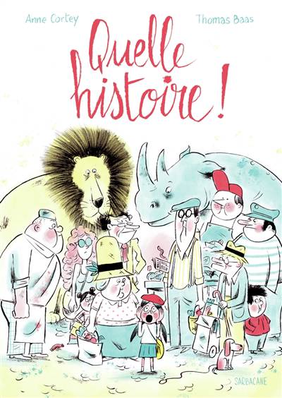 Ce matin, au marché, on ne parle que de ça : il paraît qu'un lion a débarqué en ville ! Et chacun d'ajouter son grain de sel : il aurait effrayé les clients de l'épicerie ! Et ceux du café ! Et alors est arrivé un troupeau de rhinocéros... Mais tout le monde n'est pas d'accord : Pas du tout, ça ne s'est pas passé comme ça ! Et il n'y avait qu'un seul rhinocéros ! Et...