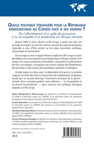 Depuis 1990, le Zaïre, devenu la RD Congo, a perdu son rôle, son prestige et sa place au sein des nations, passant du statut de puissance régionale à celui d'État assisté sur les plans sécuritaire, politique, économique et humanitaire. Cet ouvrage se veut un appel vibrant à replacer la RD Congo au coeur des débats sur la reconquête de son leadership en Afrique centrale. Il en analyse les causes profondes d'instabilité, notamment le phénomène de burn-out étatique, et propose une lecture critique des fondements, des principes et des acteurs de la politique nationale et étrangère. L'étude repose sur deux axes: la diplomatie et la guerre. Le premier s'appuie sur l'état des lieux et l'expression de la diplomatie congolaise, tandis que le second interroge l'instrument principal de la guerre: l'armée. Deux concepts guident cette réflexion - la Congosphère et la sécurité monocollective - pour repenser une politique étrangère adaptée à la RD Congo.