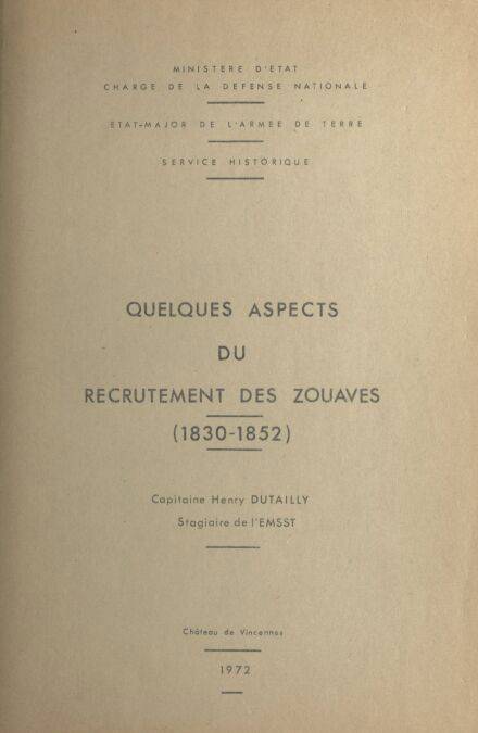 L’histoire d’un corps de troupe est celle de ses luttes et de son humble travail de chaque jour. Les historiques n’en ont retenu que les faits d’armes car le soldat doit savoir qu’il n’est pas fait pour la vie de garnison. Créés le 1er octobre 1830 sous la forme de bataillons indépendants qui fusionnèrent en 1832, devenus alors un corps qui a compté un nombre variable de bataillons puis régiment dont les hommes disaient fièrement qu’"il n’y a qu’un régiment de Zouaves comme il n’y a qu’un seul Dieu et qu’un seul soleil", les Zouaves éclatèrent en trois régiments, un par division de l’Algérie, par le décret du 12 février 1852. En 1854, leur valeur était consacrée par la formation d’un régiment de Zouaves la Garde impériale. Le Capitaine Henry DUTAILLY vous en présente les soldats : qui étaient-ils ? pourquoi venaient-ils ? et d’où venaient-ils ?