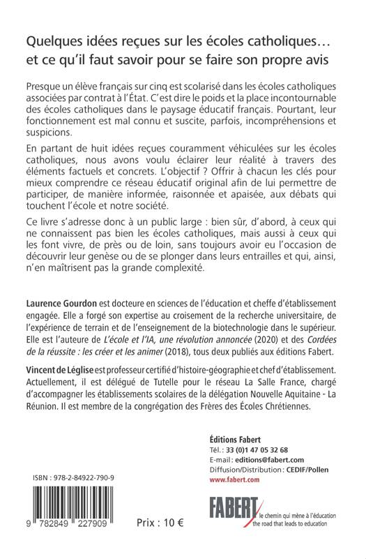 Presque un élève français sur cinq est scolarisé dans les écoles catholiques associées par contrat à l’État. C’est dire le poids et la place incontournable des écoles catholiques dans le paysage éducatif français. Pourtant, leur fonctionnement est mal connu et suscite, parfois, incompréhensions et suspicions. En partant de huit idées reçues couramment véhiculées sur les écoles catholiques, nous avons voulu éclairer leur réalité à travers des éléments factuels et concrets. L’objectif ? Offrir à chacun les clés pour mieux comprendre ce réseau éducatif original afin de lui permettre de participer, de manière informée, raisonnée et apaisée, aux débats qui touchent l’école et notre société. Ce livre s’adresse donc à un public large : bien sûr, d’abord, à ceux qui ne connaissent pas bien les écoles catholiques, mais aussi à ceux qui les font vivre, de près ou de loin, sans toujours avoir eu l’occasion de découvrir leur genèse ou de se plonger dans leurs entrailles et qui, ainsi, n’en maîtrisent pas la grande complexité.