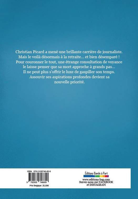Christian Picard a mené une brillante carrière de journaliste. Mais le voilà désormais à la retraite… et bien désemparé !Pour couronner le tout, une étrange consultation de voyance le laisse penser que sa mort approche à grands pas…Il ne peut plus s’offrir le luxe de gaspiller son temps. Assouvir ses aspirations profondes devient sa nouvelle priorité.