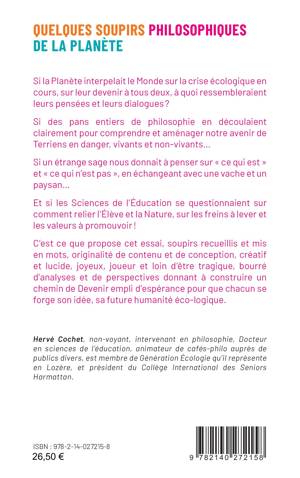 Si la Planète interpelait le Monde sur la crise écologique en cours, sur leur devenir à tous deux, à quoi ressembleraient leurs pensées et leurs dialogues ? Si des pans entiers de philosophie en découlaient clairement pour comprendre et aménager notre avenir de Terriens en danger, vivants et non-vivants. Si un étrange sage nous donnait à penser sur « ce qui est » et « ce qui n’est pas », en échangeant avec une vache et un paysan. Et si les Sciences de l’Éducation se questionnaient sur comment relier l’Élève et la Nature, sur les freins à lever et les valeurs à promouvoir ! C’est ce que propose cet essai, soupirs recueillis et mis en mots, originalité de contenu et de conception, créatif et lucide, joyeux, joueur et loin d’être tragique, bourré d’analyses et de perspectives donnant à construire un chemin de Devenir empli d’espérance pour que chacun se forge son idée, sa future humanité éco-logique.