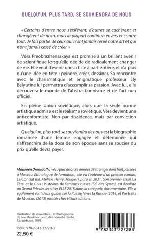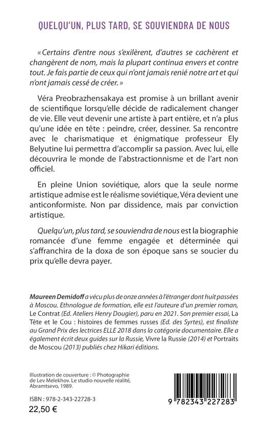 Véra Preobrazhensakaya est promise à un brillant avenir de scientifique lorsqu’elle décide de radicalement changer de vie. Elle veut devenir une artiste à part entière, et n’a plus qu’une idée en tête : peindre, créer, dessiner. Sa rencontre avec le charismatique et énigmatique professeur Ely Belyutine lui permettra d’accomplir sa passion. Avec lui, elle découvrira le monde de l’abstractionnisme et de l’art non officiel. En pleine Union soviétique, alors que la seule norme artistique admise est le réalisme soviétique, Véra devient une anticonformiste. Non par dissidence, mais par conviction artistique. Quelqu’un, plus tard, se souviendra de nous est la biographie romancée d’une femme engagée et déterminée qui s’affranchira de la doxa de son époque sans se soucier du prix qu’elle devra payer.